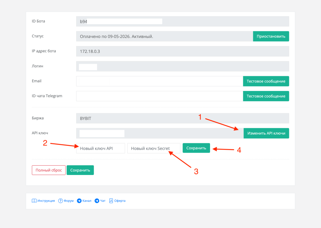 В панели управления бота нажимаем на «Изменить API ключи» (1), вводим новый API ключ (2) и секретный ключ (3), которые нам выдал ByBIT, и сохраняем их (4):