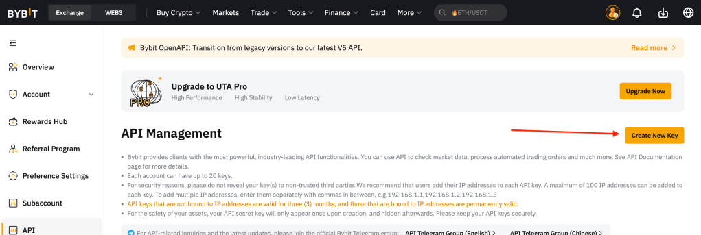 После регистрации новой учетной записи в боте необходимо зайти в ваш аккаунт на бирже и создать пару API ключей. Делается это тут:
