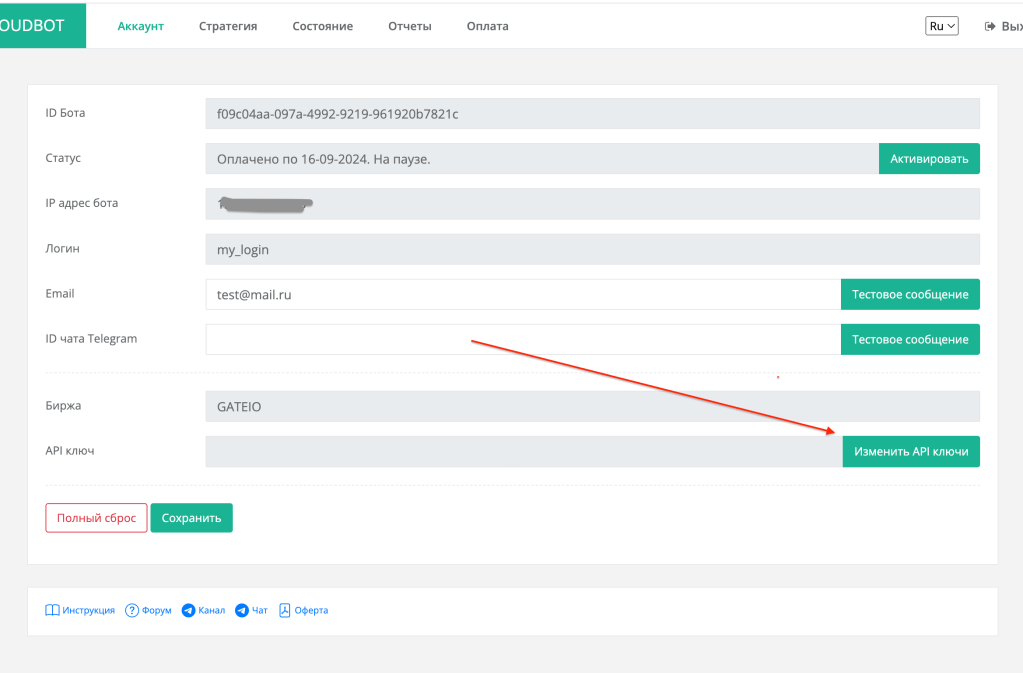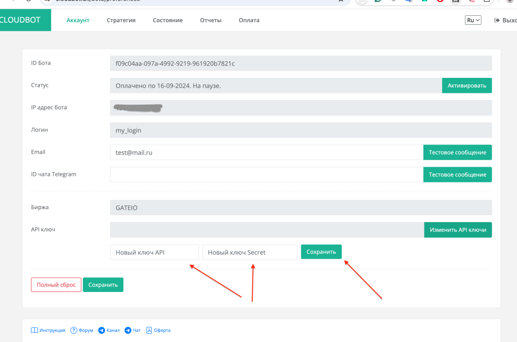 Теперь этот ключ нужно прописать в боте. Для этого на странице настройки аккаунта в панели управления ботом нажмите на кнопку «Изменить API ключи», и в появившихся двух полях введите Key и Secret ключа, после чего нажмите на кнопку «Сохранить» рядом.